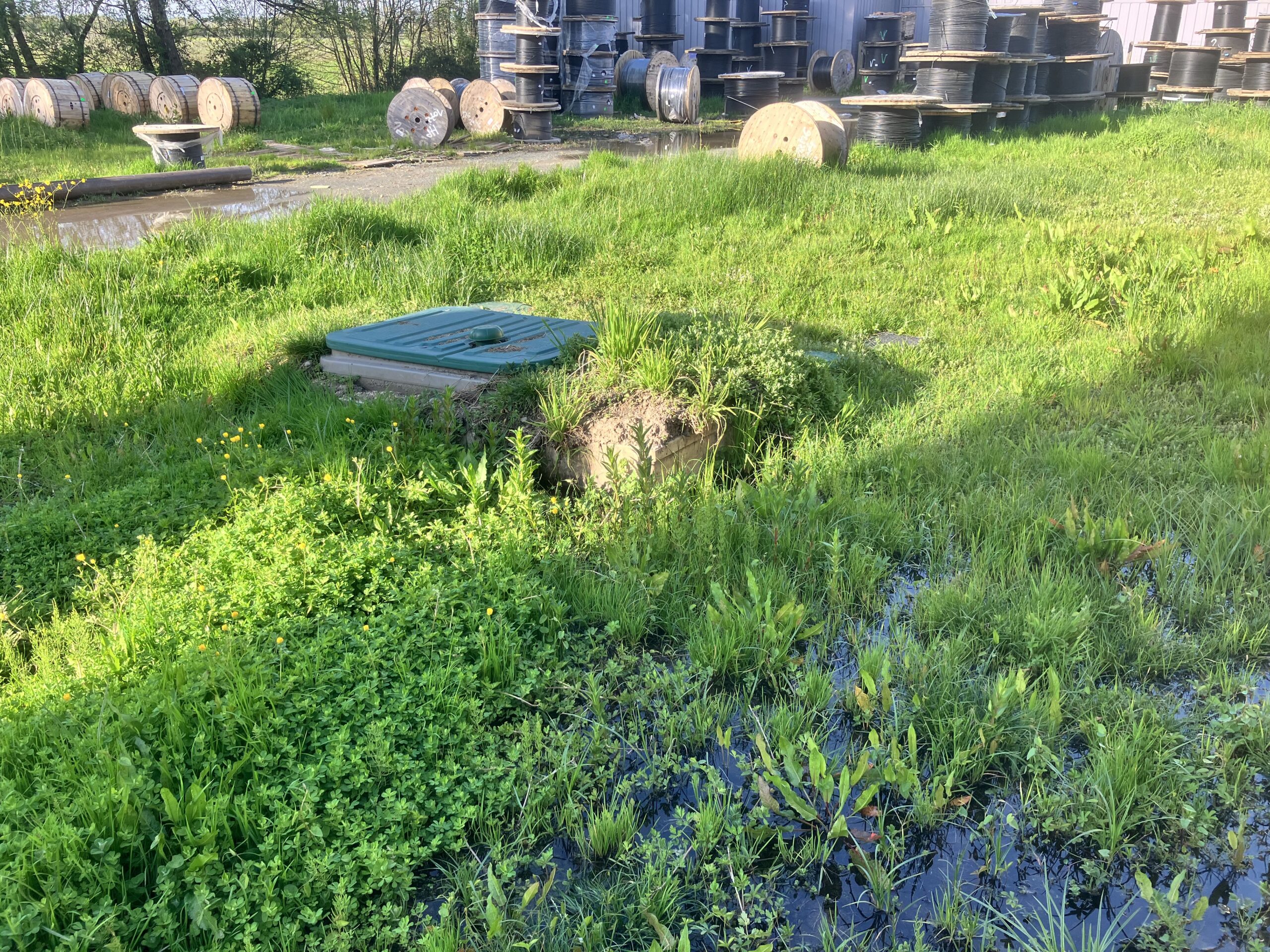 Débordement d’une microstation 9 EH. Défaut : les eaux épurées ne sont plus absorbées par le sol du fait de la présence racinaire importante dans les drains et sont rejetées à l’extérieur au niveau d’un couvercle de regard fissuré. rnPhoto© SOCABAT
